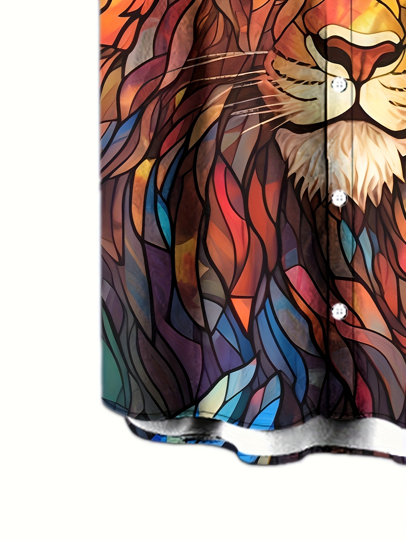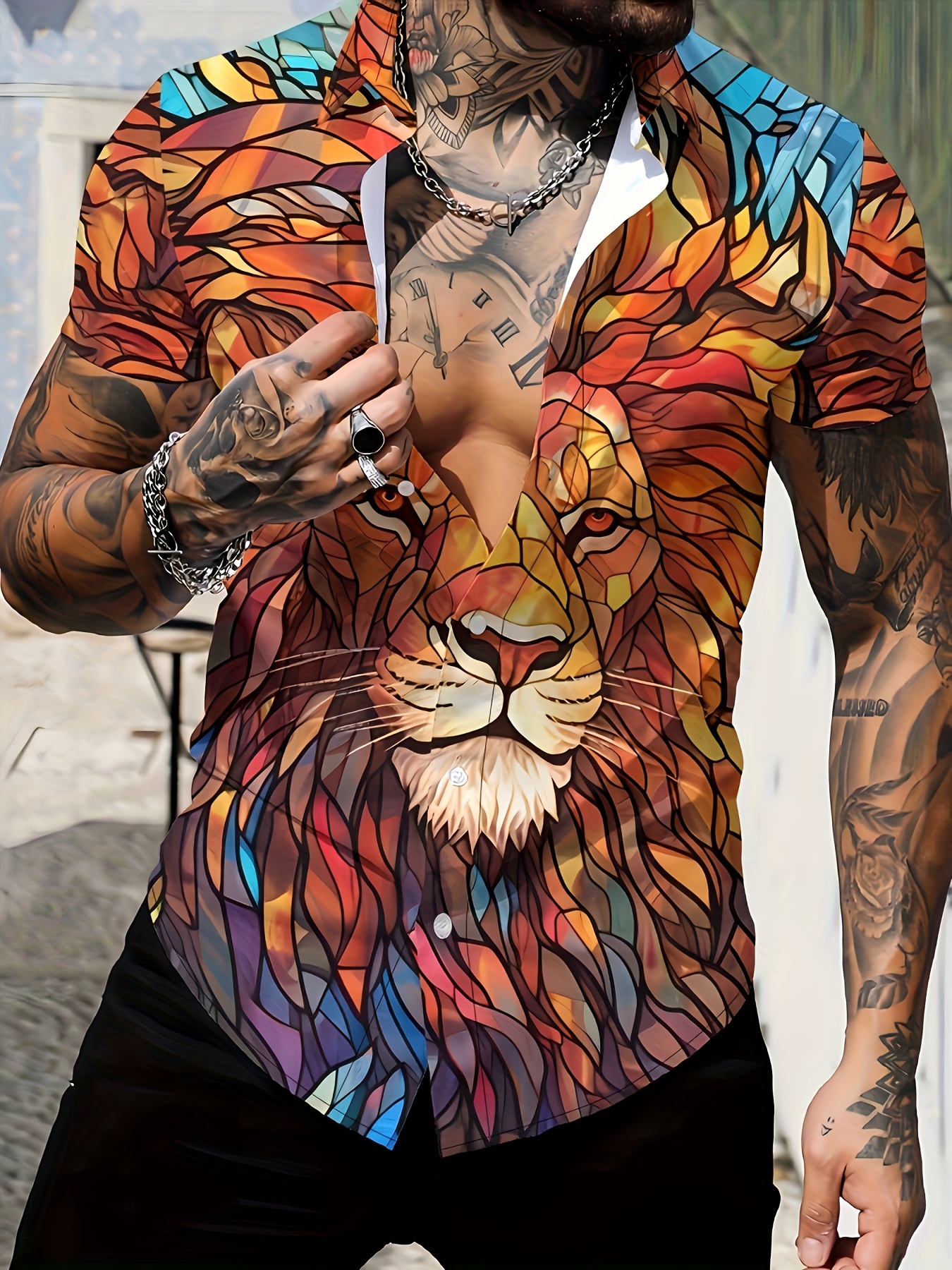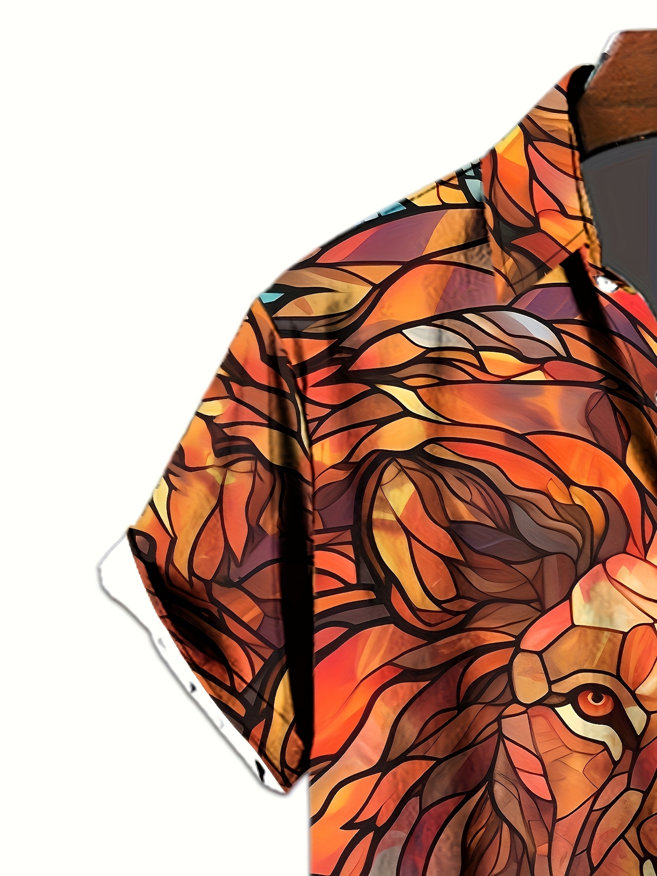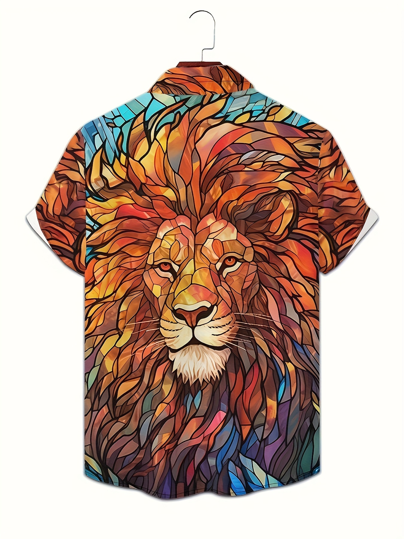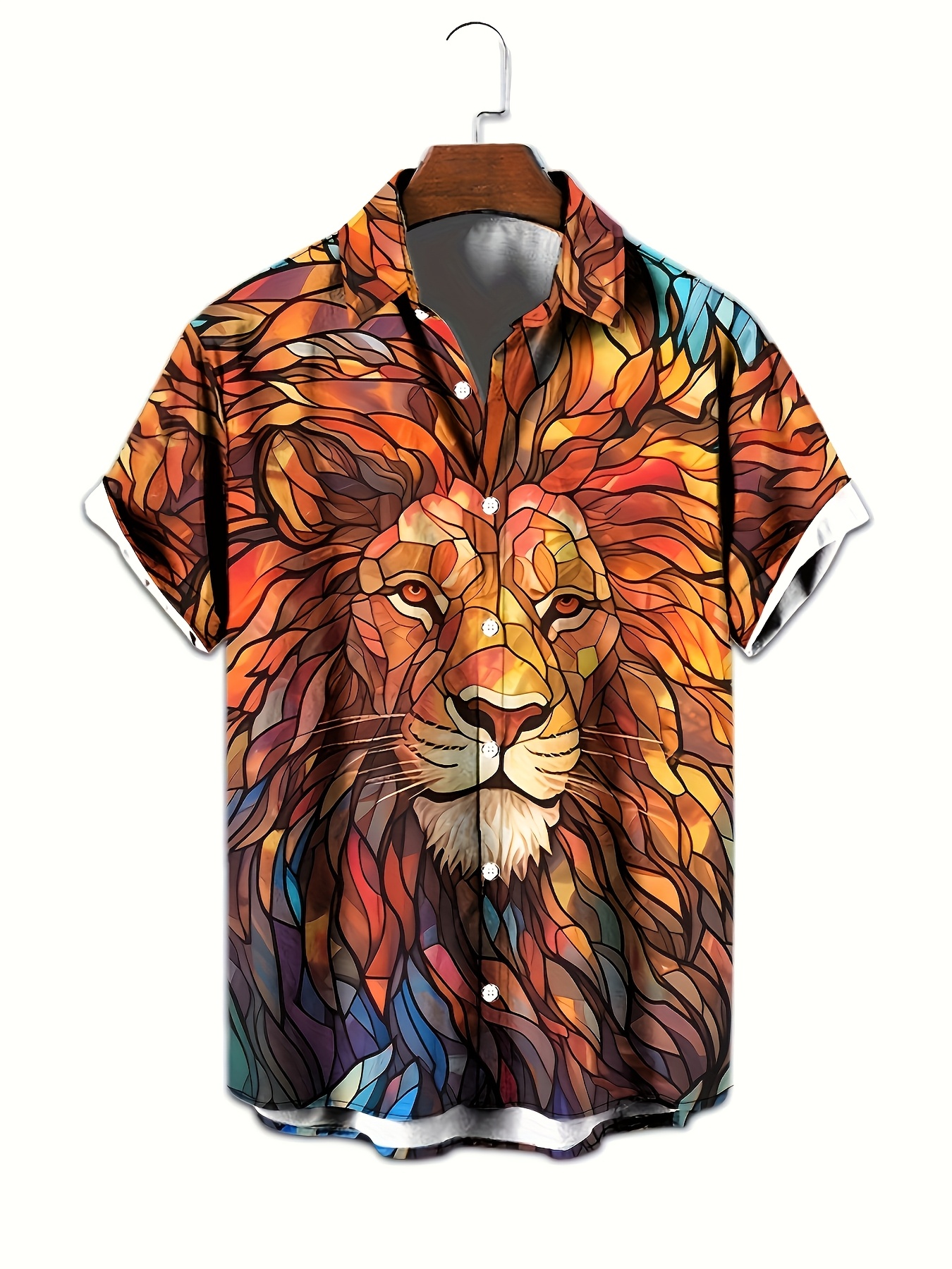 1pc Men'S Casual Short Sleeve Shirt with 3D Lion Print, Polyester Woven Fabric, Slight Stretch, Regular Fit, Lapel Collar - Animal Pattern Design