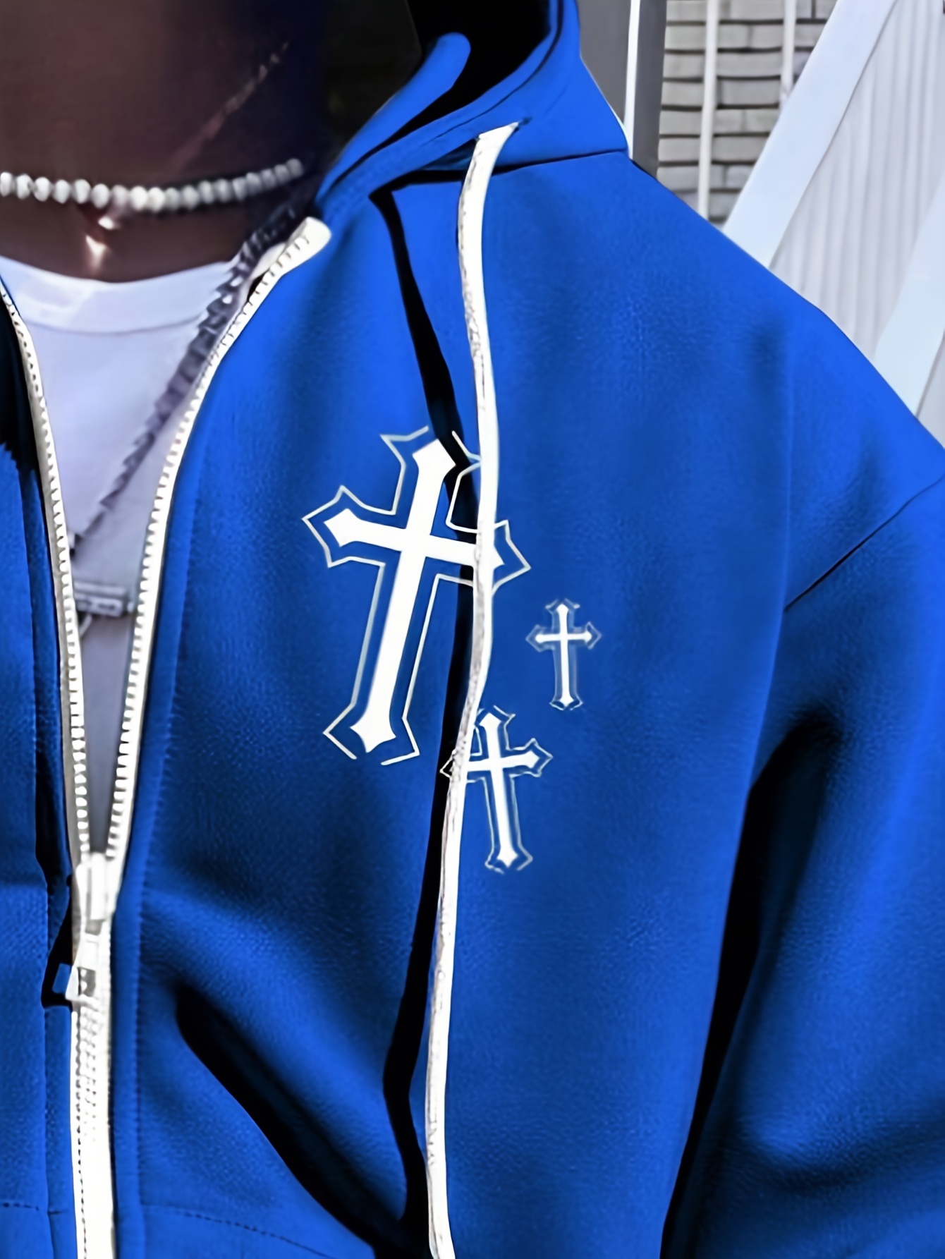 Men's Fashion Cross Print Long Sleeve Hoodie - Classic Zip-Up Design, Casual Style, Ideal For Fall And Winter