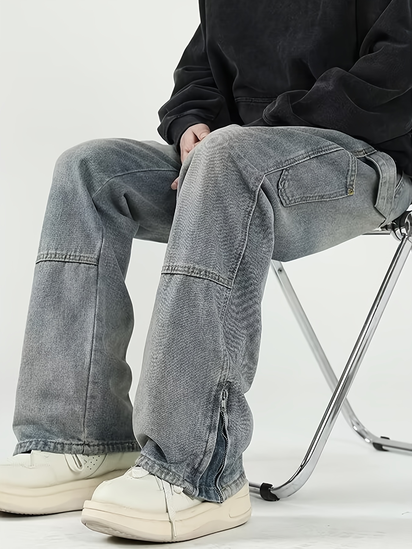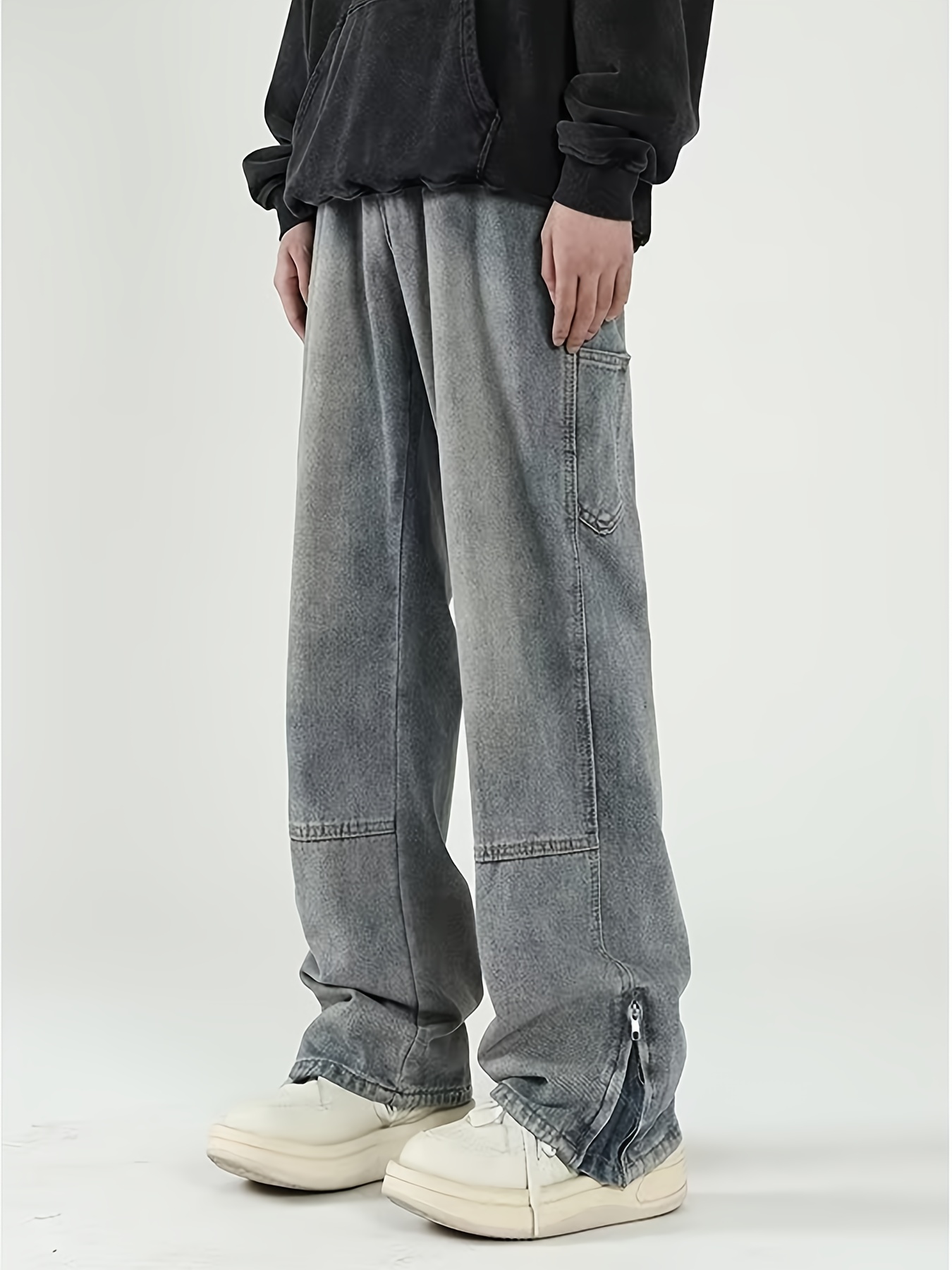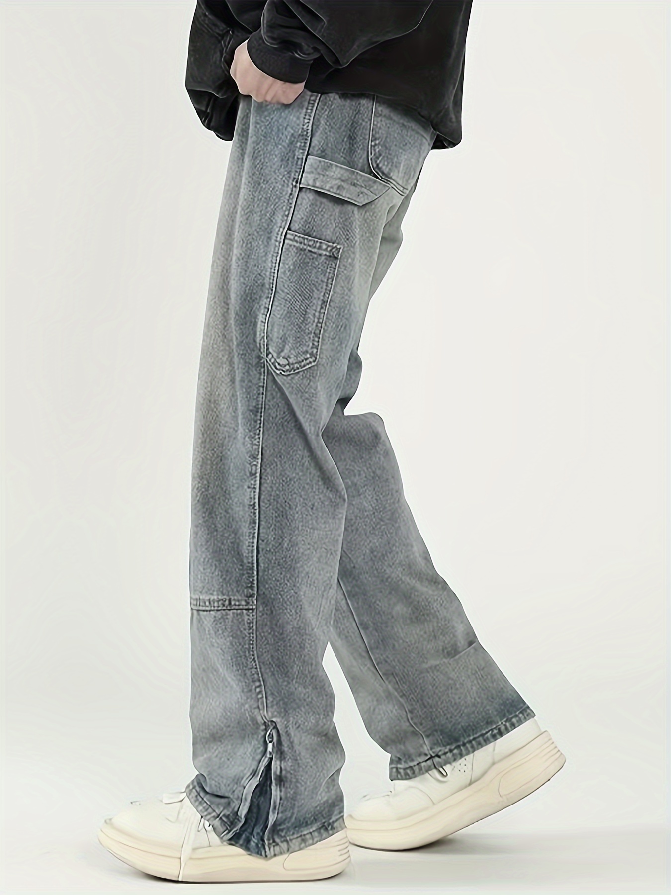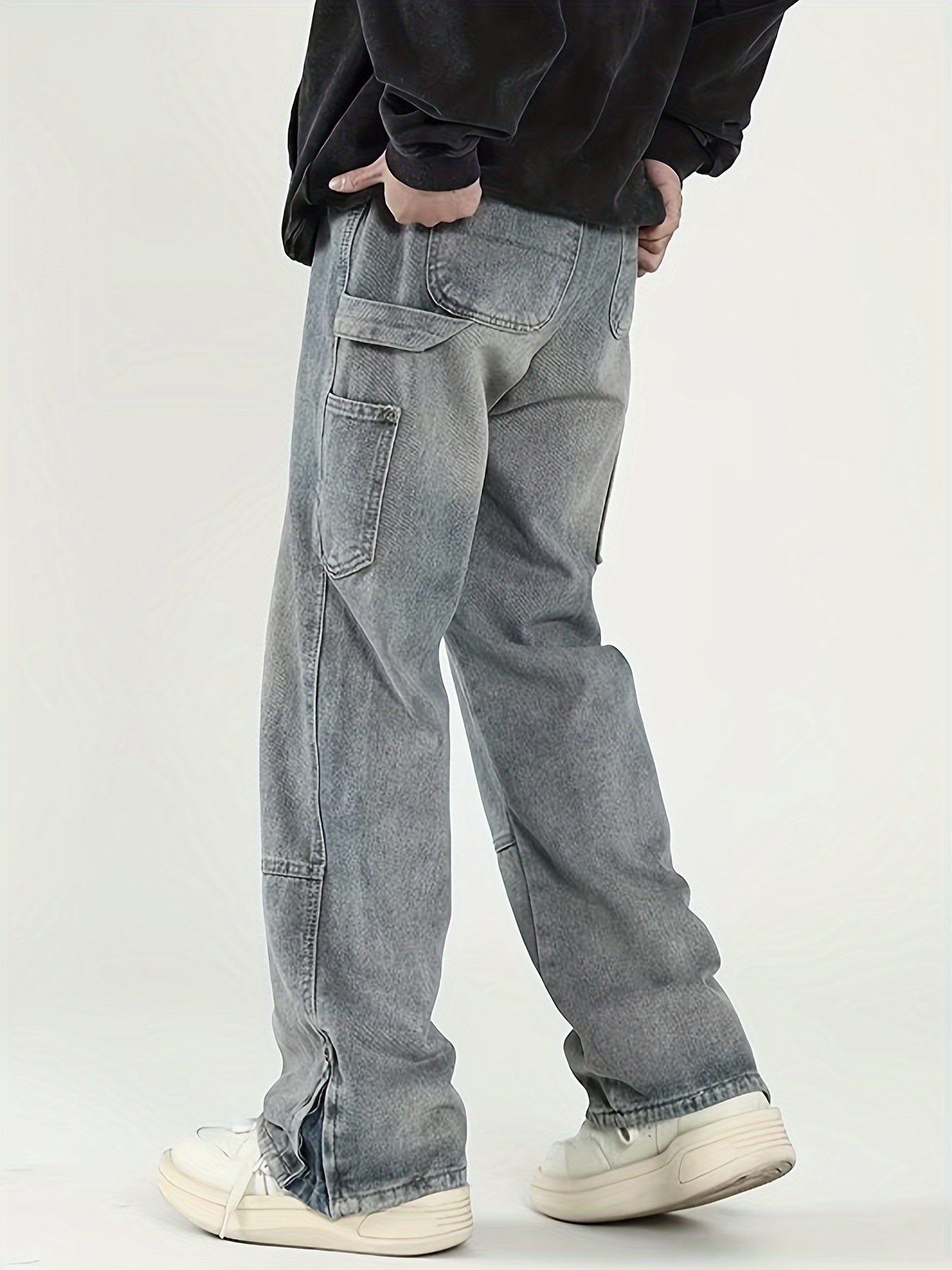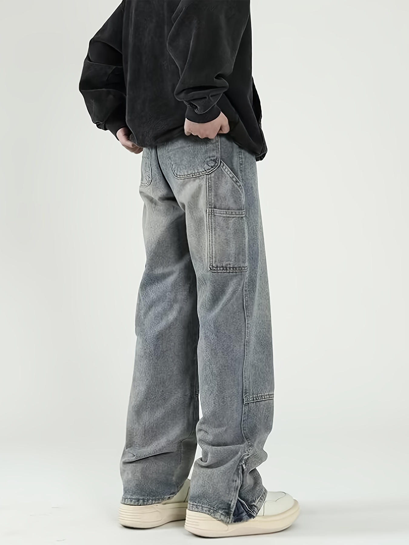 Men's Solid Denim Barrel Pants With Pockets, Vintage Style Cotton Blend Split Jeans For Spring Fall Outdoor Activities
