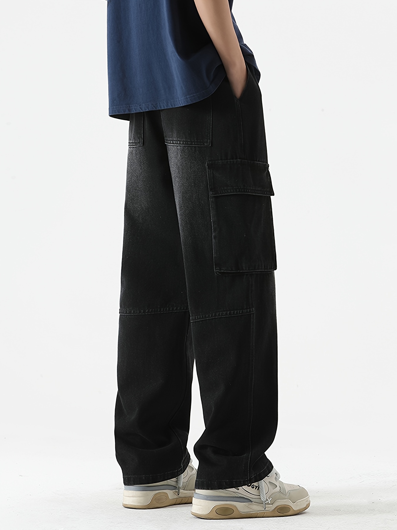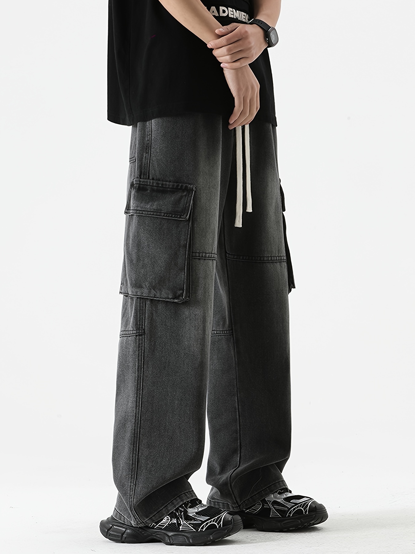 Men's Loose Gradient Color Denim Trousers With Pockets, Causal Drawstring Cotton Blend Jeans For Outdoor Activities