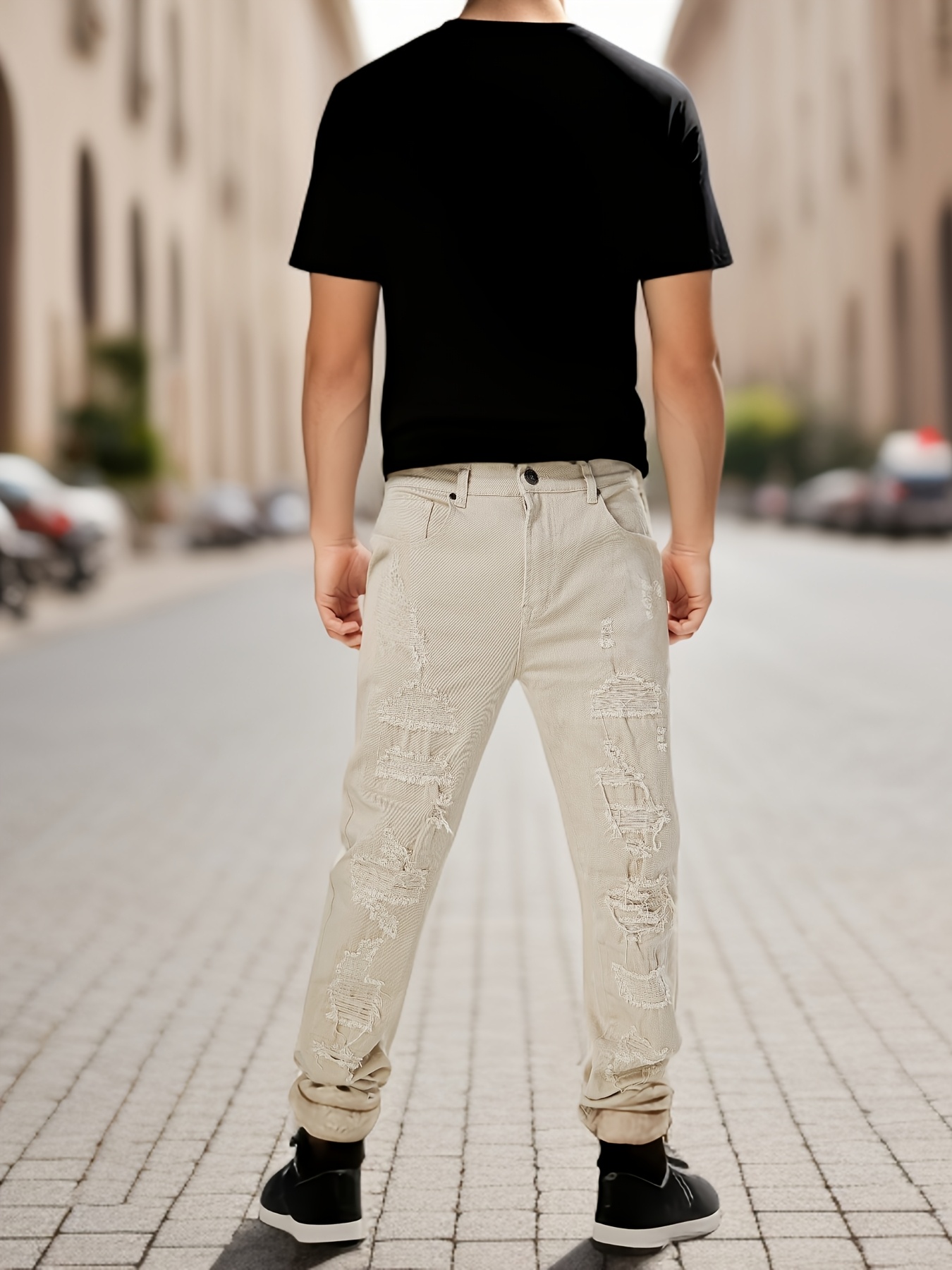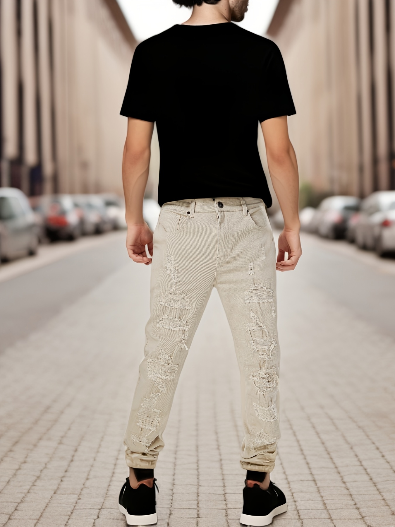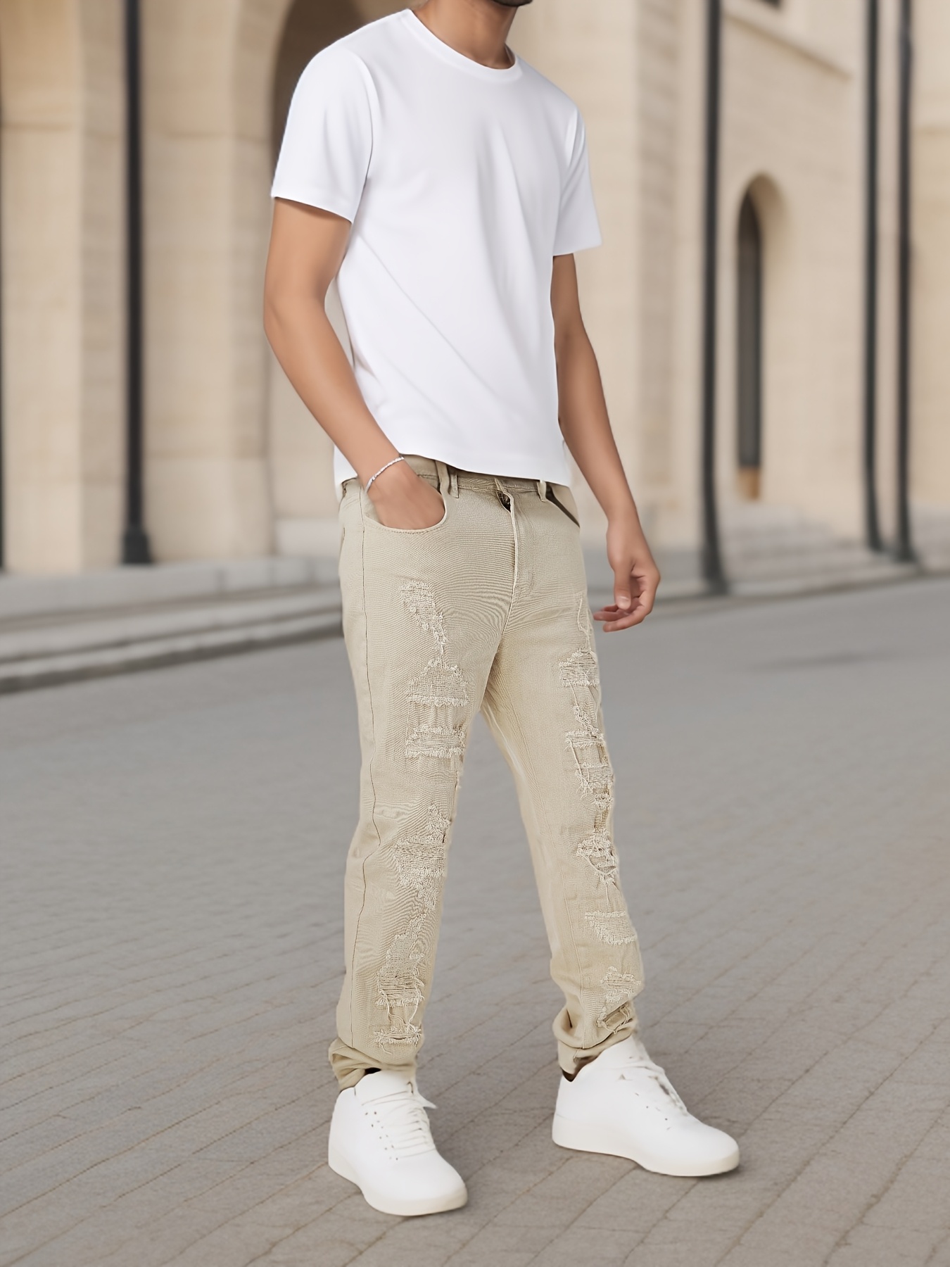 Men's Slim-Fit Stretch Cotton Jeans - Classic White, All-Season Casual Denim with Ripped Detail