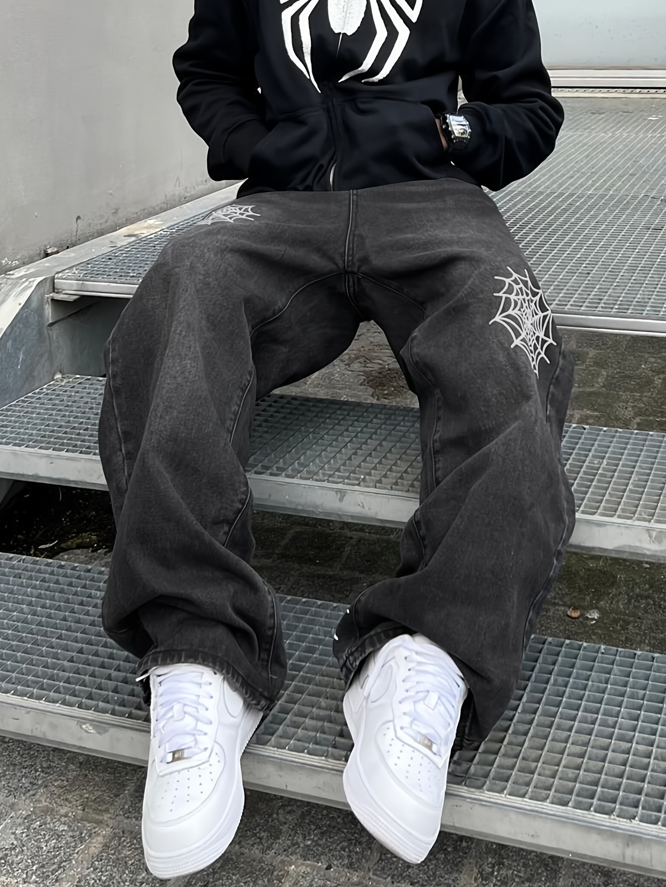 Men's Vintage Style Washed Denim Jeans with Embroidered Spider Web Design – Relaxed Fit, All-Season Casual Wear