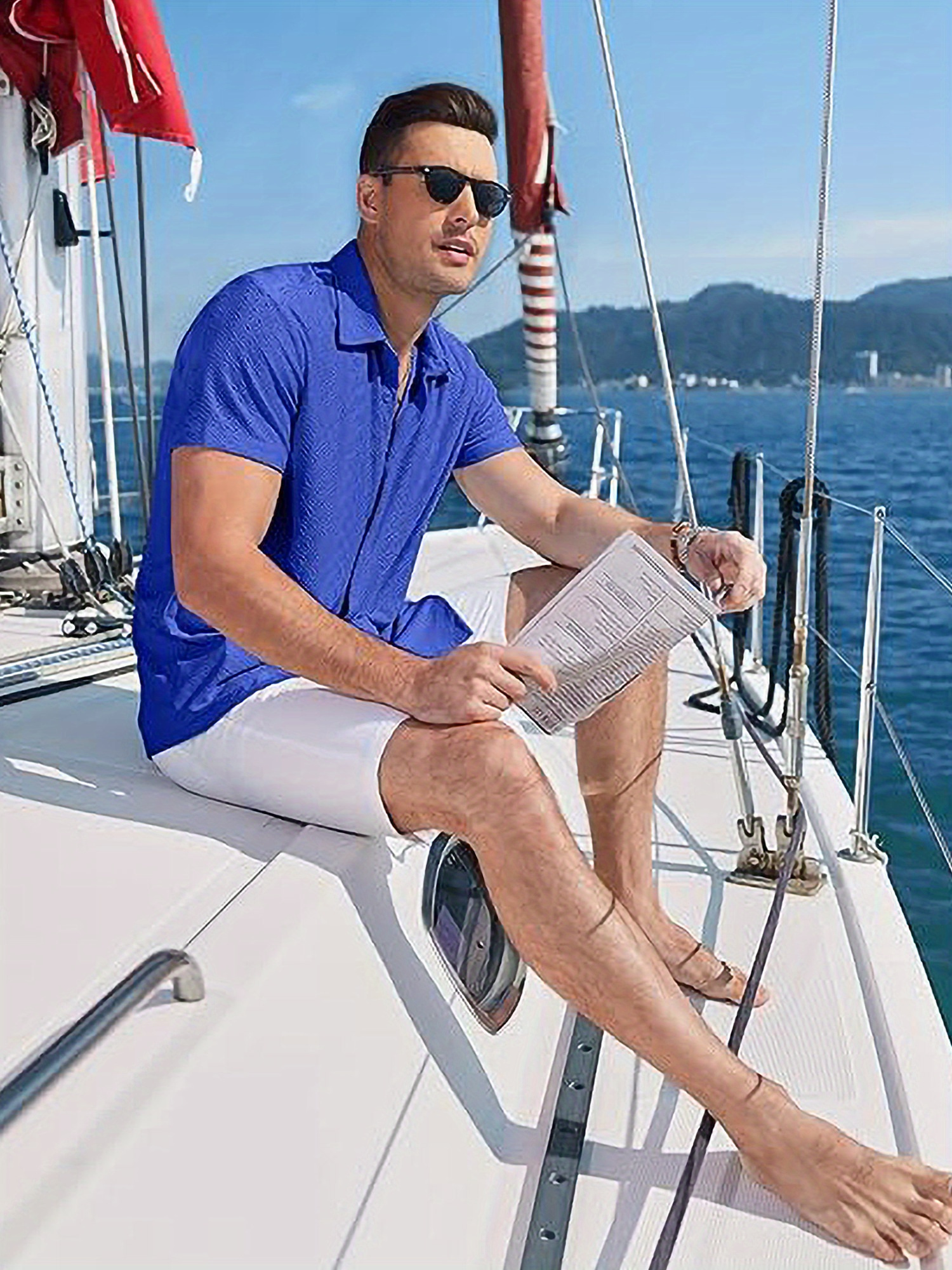 Men's Casual Button-Down Beach Shirt - Short Sleeve, Stretch Fabric, Summer Tropical Top with Turquoise Collar